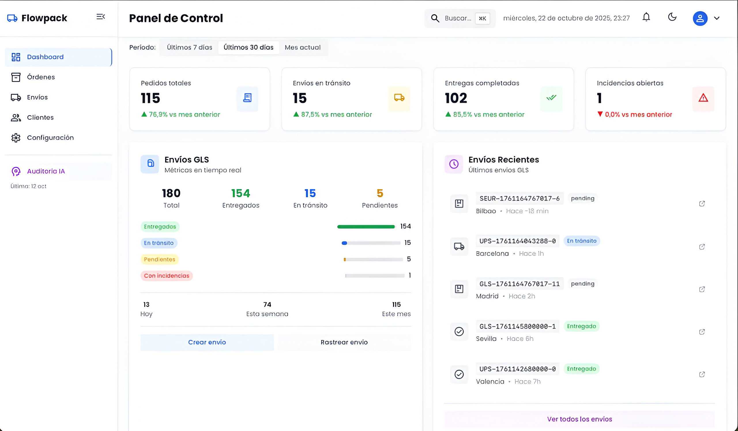FlowPack integra tu red logística con decenas de tiendas activas, aumenta tu volumen de envíos y accede a métricas en tiempo real.